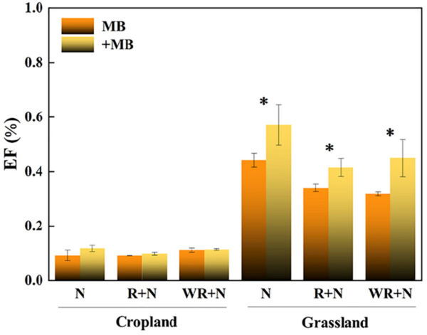 圖2土壤微生物量大小和植物殘?bào)w添加對農(nóng)田和草地土壤氧化亞氮排放因子(EF)的影響