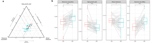 農(nóng)田土壤顯著降低了土壤生物群落在分類(lèi)組成、功能基因和生態(tài)策略的空間異質(zhì)性。農(nóng)田土壤中細(xì)菌、真菌、古菌、微型動(dòng)物群落(圖1)及功能基因(圖2)在局域和區(qū)域尺度均表現(xiàn)出顯著的均質(zhì)化趨勢(shì),這種均質(zhì)化現(xiàn)象與土壤性質(zhì)的趨同性密切相關(guān)。農(nóng)業(yè)活動(dòng)改變了細(xì)菌群落的生態(tài)策略(“Y-A-S” 理論框架,圖3),其資源獲取(A策略)的功能基因減少,而與生長(zhǎng)產(chǎn)量(Y策略)和脅迫耐受(S策略)的基因顯著增加,表明農(nóng)業(yè)系統(tǒng)更傾向于選擇快速生長(zhǎng)、抗逆性強(qiáng)的微生物類(lèi)群。農(nóng)田土壤中細(xì)菌的平均基因組大小顯著減小,反映了在農(nóng)業(yè)干擾下微生物通過(guò)“基因組精簡(jiǎn)”(Black Queen hypothesis)降低了生物的代謝成本、提高了適應(yīng)性的生態(tài)權(quán)衡。