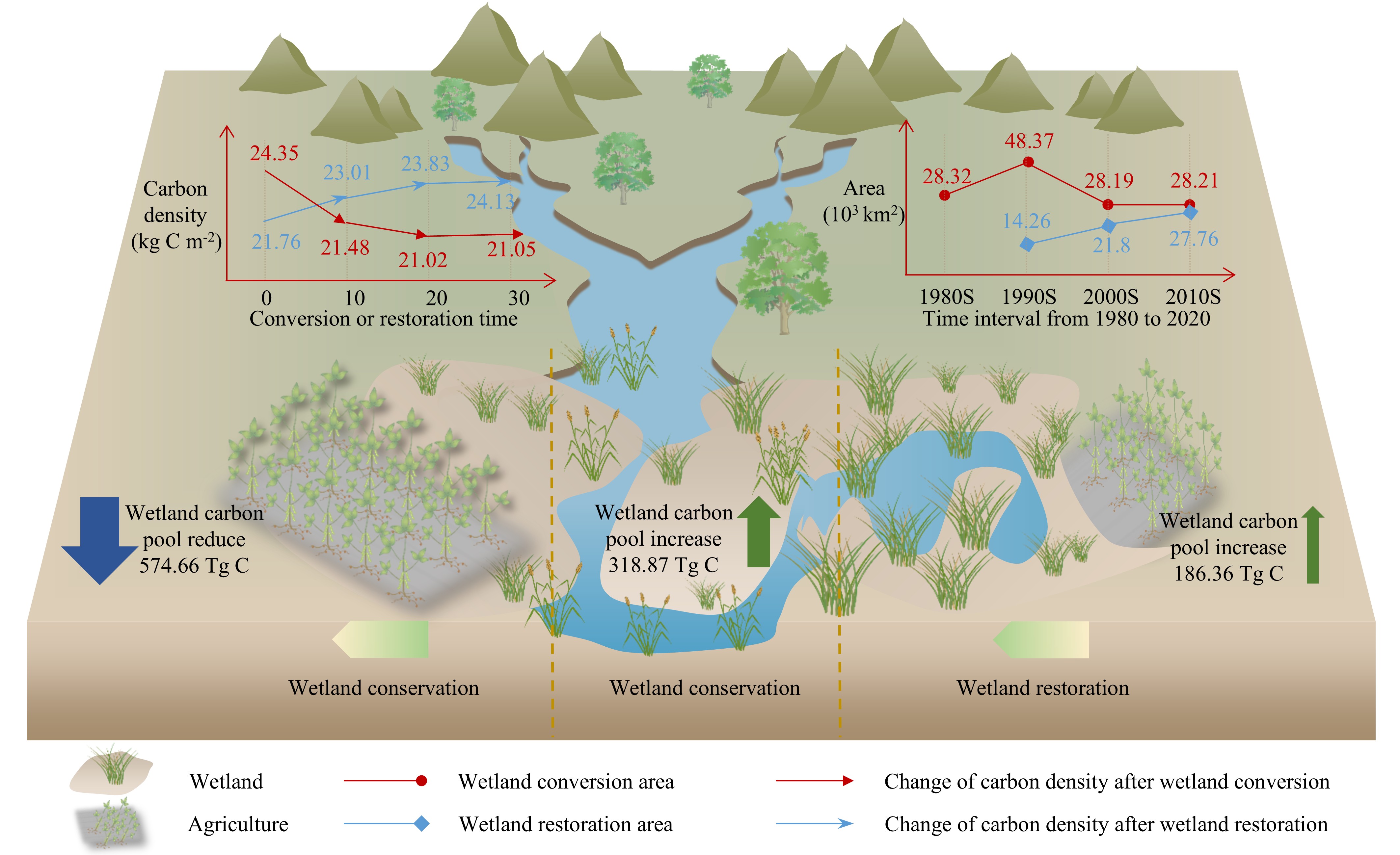 研究結(jié)果表明:在研究期內(nèi),我國(guó)濕地農(nóng)田化導(dǎo)致了明顯的土壤有機(jī)碳損失,其中約86%的碳損失發(fā)生在轉(zhuǎn)化后的前10年,隨后下降速度減緩并逐漸趨于穩(wěn)定。在這四十年間,濕地農(nóng)田化導(dǎo)致累計(jì)碳損失約 574.66 Tg C,相當(dāng)于全國(guó)濕地土壤碳庫(kù)的約 10.6%。相比之下,濕地恢復(fù)(退耕還濕)促進(jìn)了土壤有機(jī)碳的增加,盡管水平仍低于改造前的水平。保護(hù)和恢復(fù)措施能夠共同抵消濕地農(nóng)田化所導(dǎo)致的一多半碳損失;其中,恢復(fù)措施貢獻(xiàn)了 186.36 Tg C碳增加(約占濕地土壤碳庫(kù)的 3.43%),抵消了約 32.4%的濕地農(nóng)田化導(dǎo)致的碳損失。