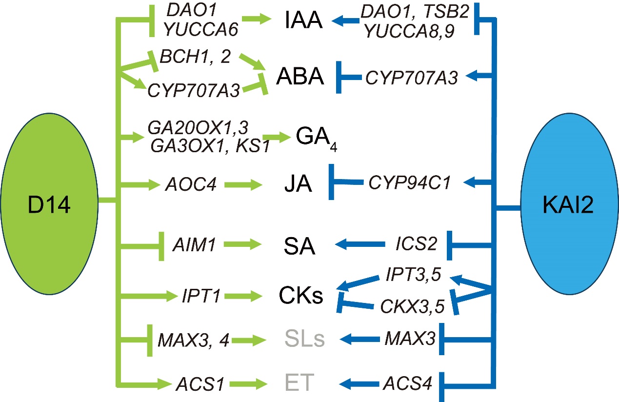圖3. 擬南芥D14與KAI2調(diào)控激素含量及代謝基因表達(dá)的模型