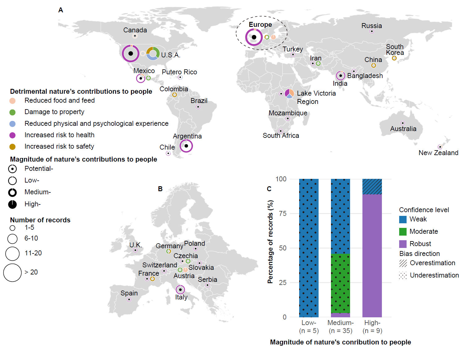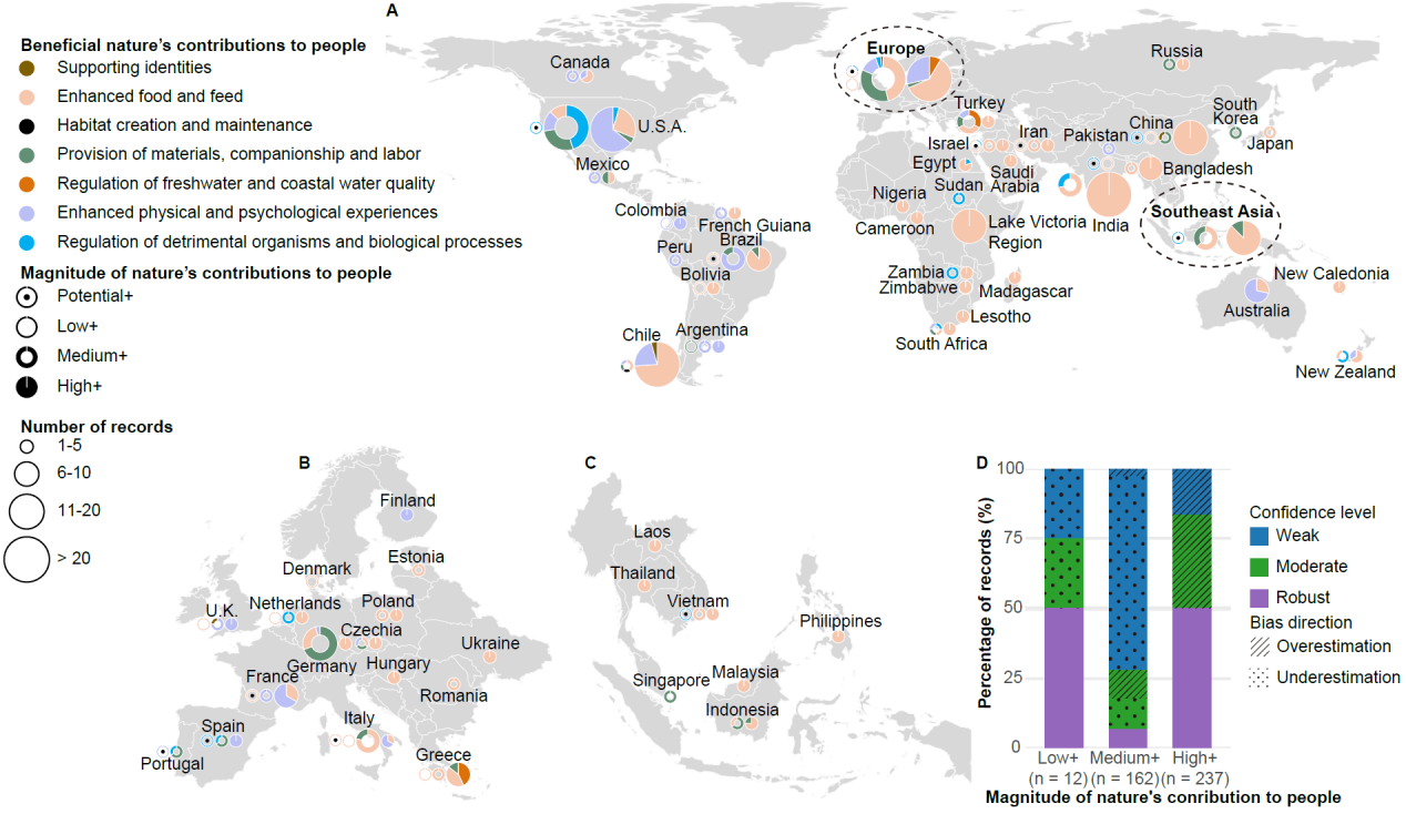 該研究基于“自然對人類貢獻(xiàn)(Nature’s Contributions to People)”框架開發(fā)了一套半定量評估方法,系統(tǒng)性評估了全球外來淡水大型動物對人類社會產(chǎn)生的正面與負(fù)面影響。研究結(jié)果表明,已有 93種外來淡水大型動物(占現(xiàn)存物種的43%)被引入到其本土分布區(qū)之外,涵蓋了魚類、哺乳類、爬行類和兩棲類。該研究共識別了429項正面社會經(jīng)濟(jì)效應(yīng)記錄(圖1),包括提升食物供給(57%)、促進(jìn)休閑漁業(yè)和生態(tài)旅游(20%)以及提供生產(chǎn)和貿(mào)易所需的原材料供給(12%)等。一些淡水大型動物如鯉魚(Cyprinus carpio)、草魚(Ctenopharyngodon idella)和尖齒胡鯰?(Clarias gariepinus)等在全球多地被引入后已成為當(dāng)?shù)鼐用裰匾氖澄飦碓春蜐O業(yè)資源,而尼羅鱷(Crocodylus niloticus)和暹羅鱷等(Crocodylus siamensis)則常被引入到本土分布區(qū)之外用于發(fā)展養(yǎng)殖業(yè)和寵物貿(mào)易。研究還發(fā)現(xiàn),亞洲和非洲引入外來淡水大型動物的主要動機(jī)是增強(qiáng)食物供給,而在北美則主要與休閑漁業(yè)和寵物貿(mào)易相關(guān)。