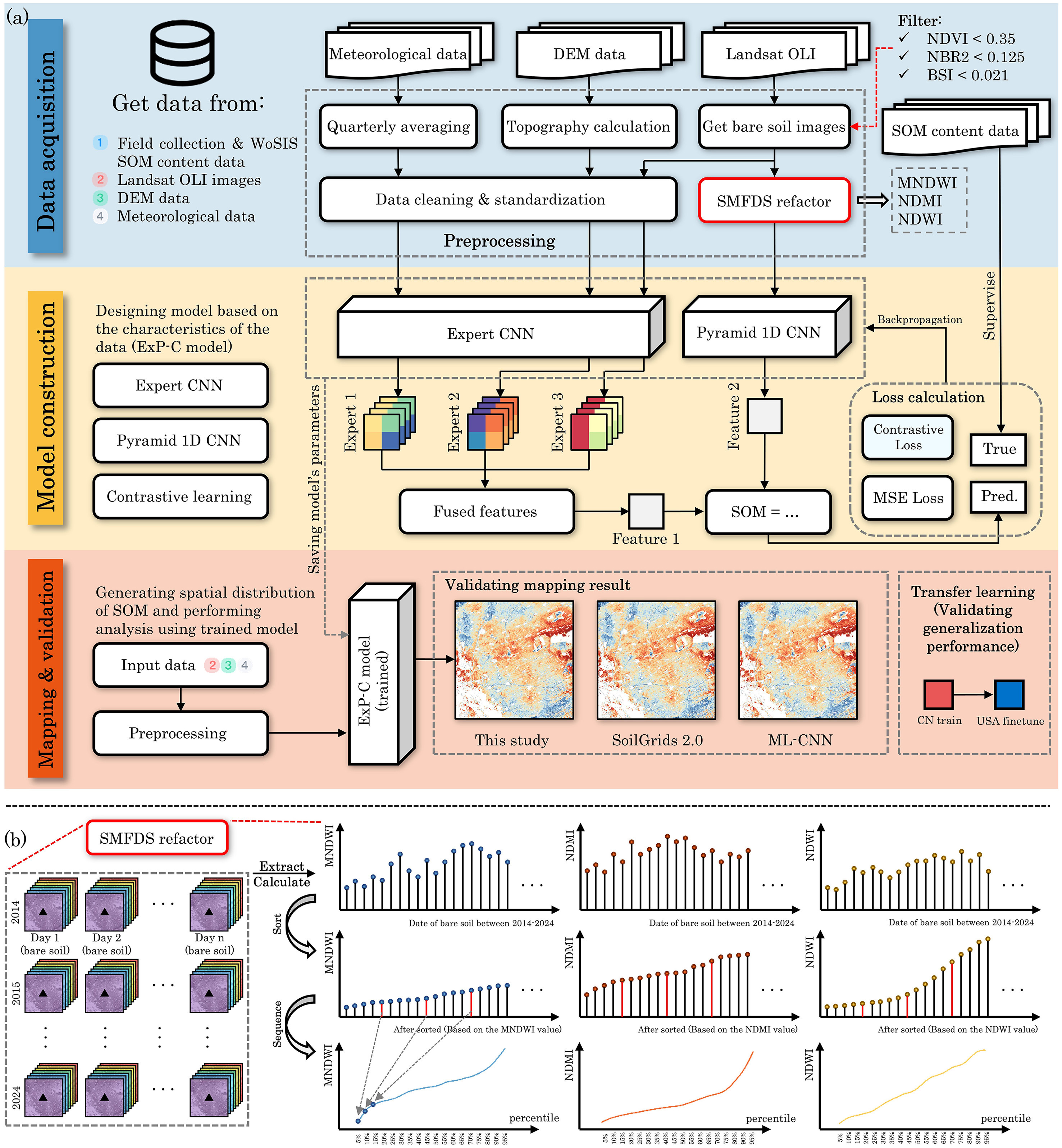 針對上述局限性,中國科學(xué)院東北地理與農(nóng)業(yè)生態(tài)研究所農(nóng)業(yè)遙感學(xué)科組以中美兩大典型黑土區(qū)(中國東北和美國密西西比河流域)的耕地為研究對象,創(chuàng)新性地提出了一種融合土壤水分動態(tài)反饋序列(SMDFS)的新型時空深度學(xué)習(xí)框架(ExP-C)。研究團隊收集了2014-2024年間的2616個表層(0-20厘米)土壤實測樣本,并深度融合了Landsat-8裸土合成影像、SRTM地形變量以及ERA5氣象等多源數(shù)據(jù)。研究通過對多時相水分相關(guān)光譜指數(shù)(MNDWI、NDWI、NDMI)進行百分位重構(gòu)生成了SMDFS,從而精準捕捉了不同SOM水平與土壤水分保持能力之間的動態(tài)反饋特征。在此基礎(chǔ)上構(gòu)建的ExP-C模型,融合了用于提取靜態(tài)協(xié)變量空間上下文特征的“專家卷積網(wǎng)絡(luò)”,以及用于挖掘多尺度SMDFS時間序列模式的“金字塔1D卷積網(wǎng)絡(luò)”,并結(jié)合對比學(xué)習(xí)策略進一步增強了模型的特征表示能力。
