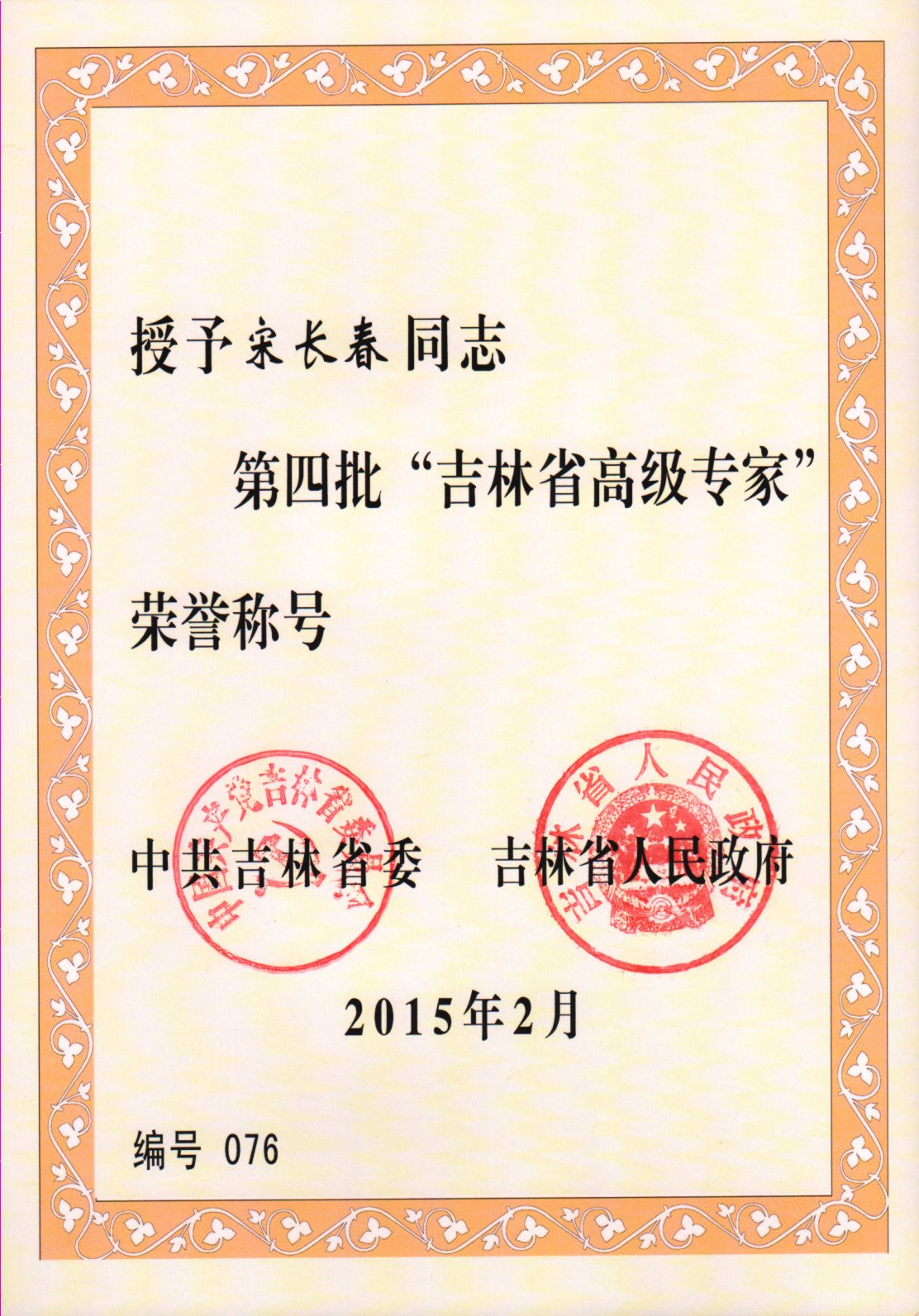 為深入實施人才強省戰略,發揮人才的引領和帶動作用,集聚培育一批高層次領軍型人才,經嚴格評選,我單位宋長春同志被吉林省委、省政府授予第四批“吉林省高級專家”榮譽稱號。吉林省高級專家是省委、省政府授予在吉林省工作的高層次人才的最高榮譽稱號,每三年評選一次。