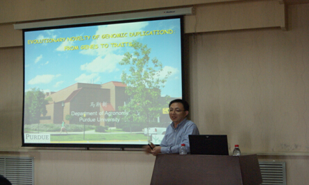 2015年7月3日,“大豆分子設(shè)計育種”創(chuàng)新團隊國際合作伙伴--美國普渡大學馬漸新教授來我所做了題為“Evolutionary novelty of genomic duplication:from genes to traits”的精彩學術(shù)報告。報告會由實驗室副主任孔凡江研究員主持,長春所區(qū)和哈爾濱園區(qū)的相關(guān)科研人員和研究生聽取了報告。