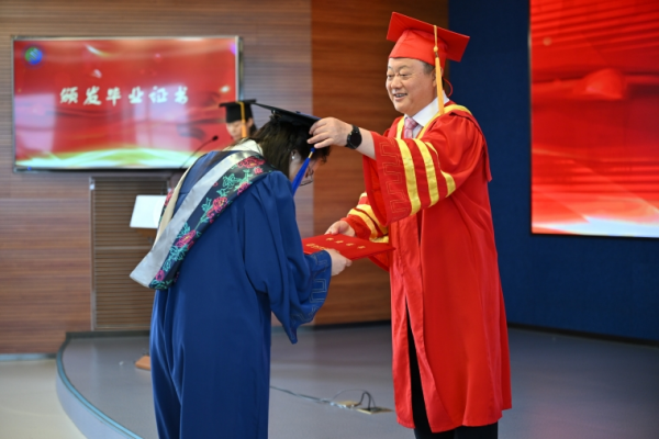 在學(xué)位授予儀式環(huán)節(jié)中,畢業(yè)生依次上臺(tái),姜明為全體畢業(yè)生頒發(fā)了畢業(yè)證書,并為畢業(yè)生扶正流蘇,合影留念。