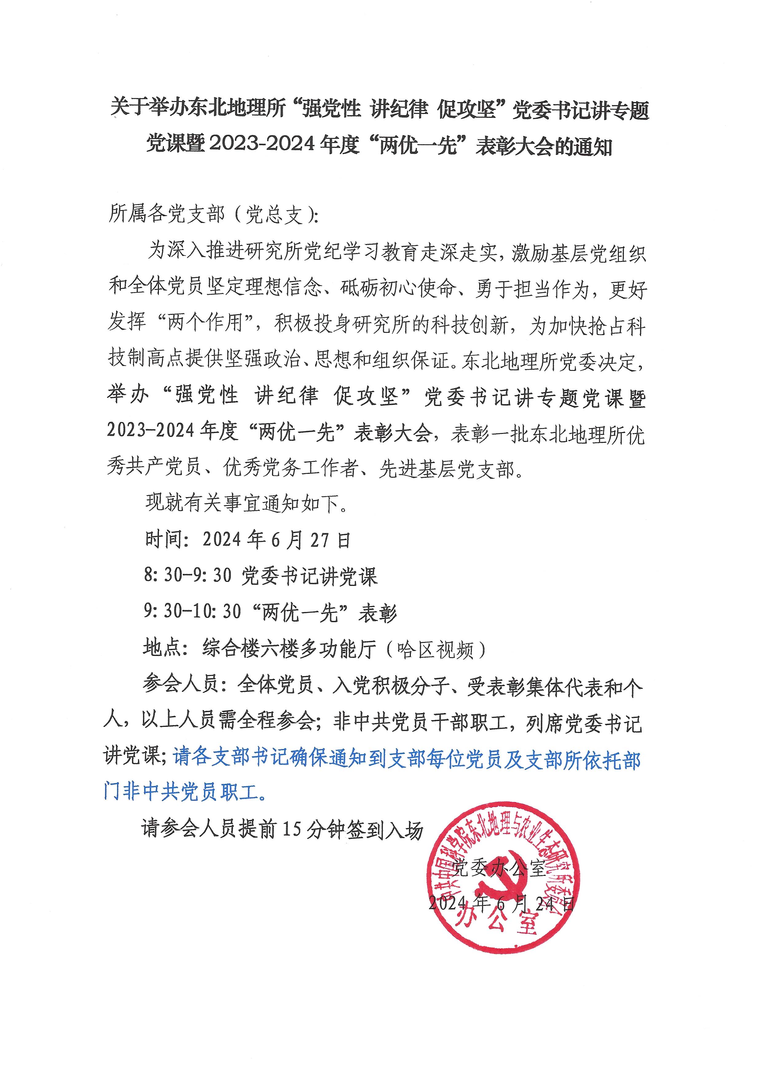 關(guān)于舉辦東北地理所“強黨性 講紀(jì)律 促攻堅”黨委書記講專題黨課暨 2023-2024年度“兩優(yōu)一先”表彰大會的通知